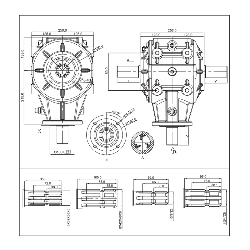 KLF250 omjer prijenosa za povećanje brzine je 1: 3, može se prilagoditi mnogim različitim vrstama poljoprivrednih strojeva i opreme, strojeva za drobljenje mulcher slame, strojeva za oporavak od poljoprivrednih rezidualnih filmova i tako dalje. Gleason Bevel zupčanici obrađuju se s velikom preciznošću, s visokom preciznošću mrežice, malim gubitkom prijenosa i visokom učinkovitošću prijenosa energije.UPUT SPEET 540R/min, izlazne brzine 1620R/min, nazivni snaga 80hp, maksimalna snaga 100HP 100HP